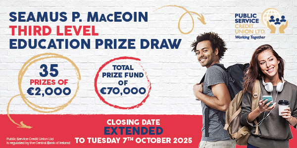 Third level education is exciting for the student but it can also be expensive. Public Service Credit Union (PSCU) recognises this burden and is delighted to announce our 18th Education Prize Draw with a Prize Fund of €70,000.